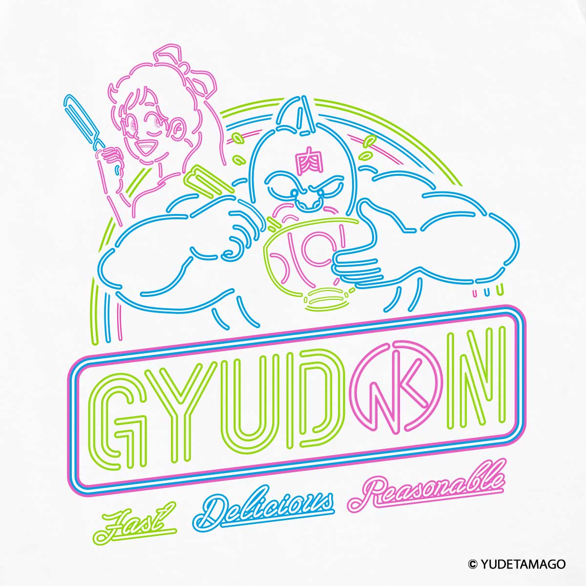 大好物の牛丼を頬張るキン肉マンと、料理に勤しむビビンバ(強盗じゃありません)のネオン風デザインTシャツが KIN29.COM限定カラー [ホワイト] ボディで登場!