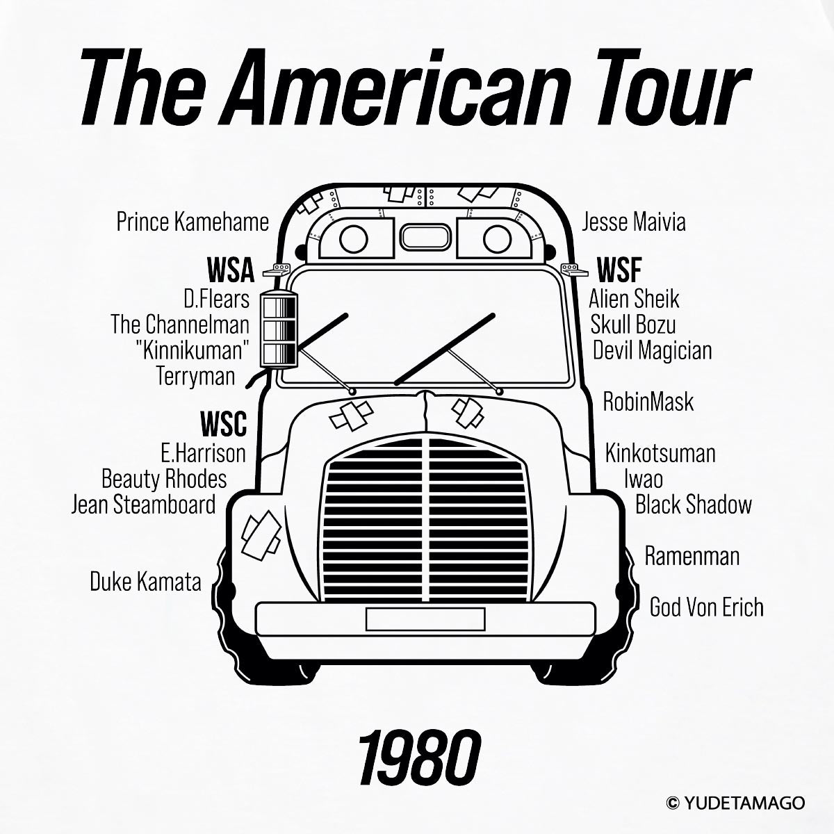 アメリカ遠征編に登場した豪華キャストが勢揃い!ザ・マシンガンズチーム御一行を乗せたオンボロバスをバックにプリントしました。